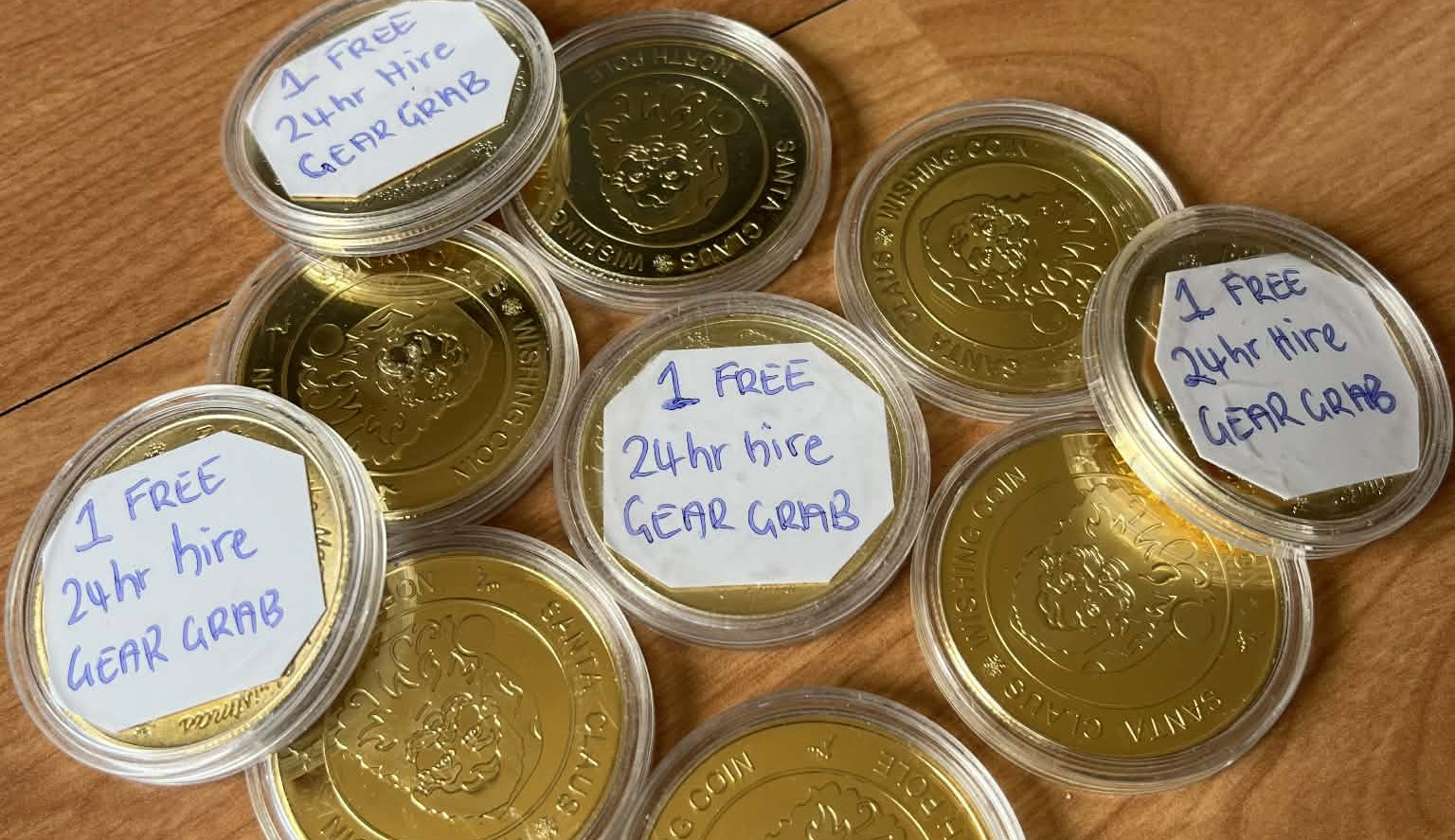 To claim your free hire at Gear Grab just come in with the coin(with little ticket thing) and tell us the exact location you found it and we will add a free hire to your account. Hires have to be 18+ so if a under 18 finds the coin a parent or caregiver will have to claim the hire.