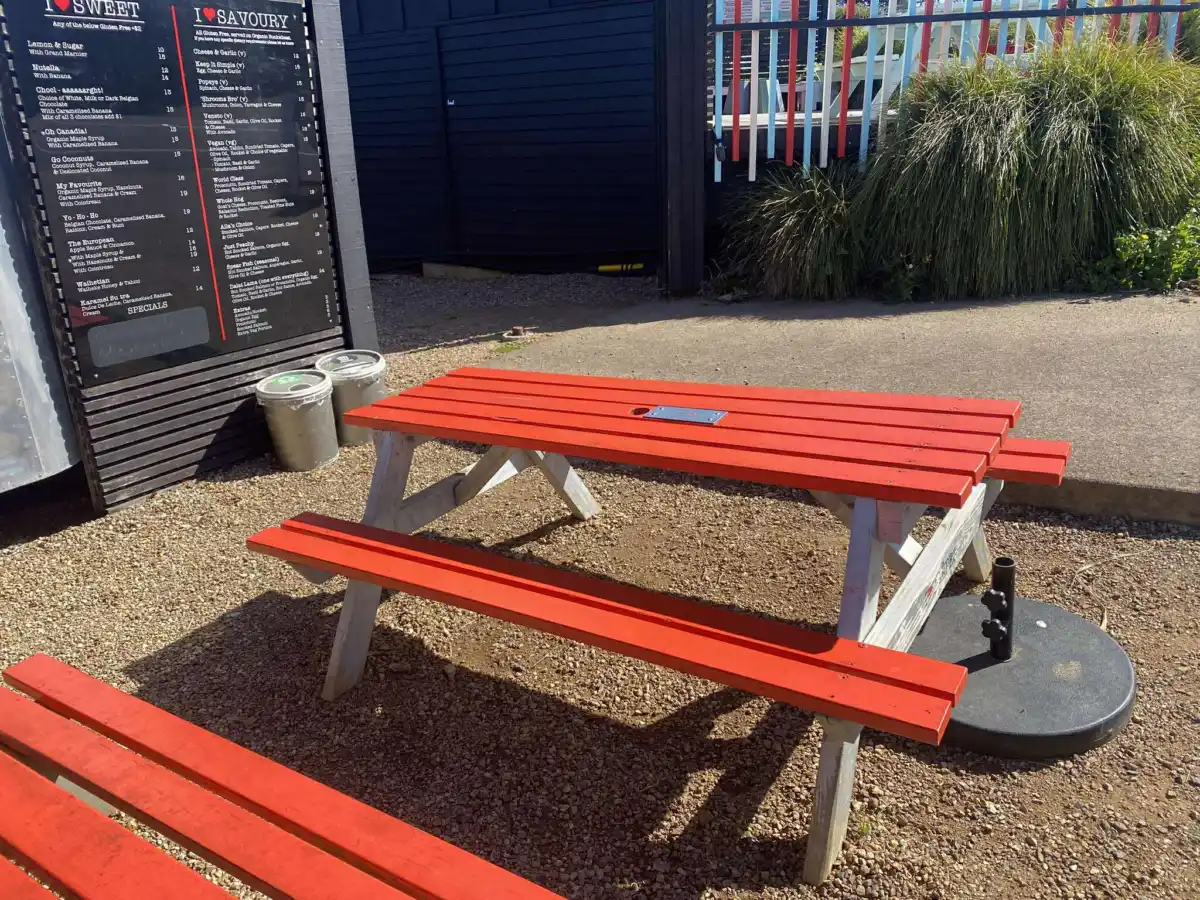 You can either sit in front of the caravan at their table setting and enjoy your meal or takeaway with you.