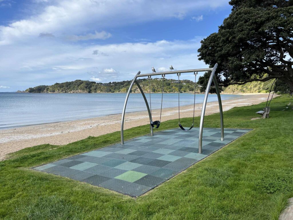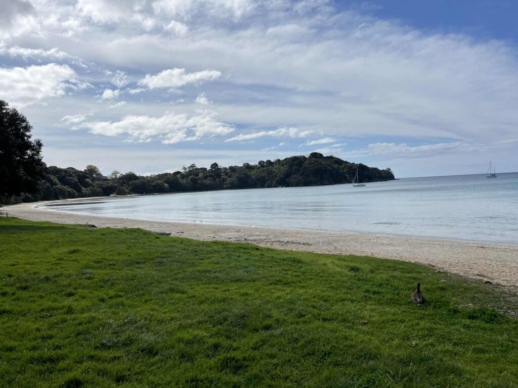 Oneroa Beach is made of sand has plenty of pathways down, with ample room on the grass berms to take in the views of Oneroa beach.