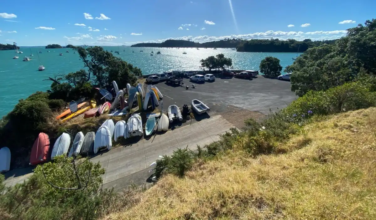 There are about 6-8 parks designed for cars towing boats, plus some side parking for regular length cars. There is a dinghy/kayak storage rack. Waiheke locals leave dinghies parked around the storage rack and on the edge of the ramp. About 50 metres back from the parking lot there are about 3-6 gravel carparks. Take care when visiting this carpark as the road has caved in and has not been properly fixed.