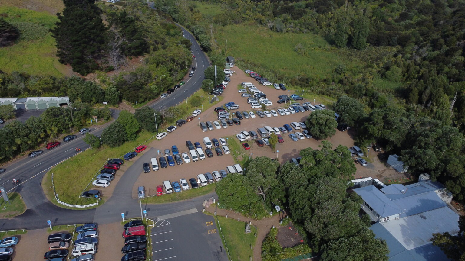 Matiatia upper gravel carpark or “Matiatia gravel carpark” – that’s what the locals call it. The official name is Owhanake Carpark. The parking lot is 8-10 minutes walk from the Fullers terminal. This is much further away from the terminal than Matiatia main carpark. The carpark consists of about 130-150 unmarked gravel parks. You just have to find a parking spot.This carpark is normally busy as you can see from the photos.