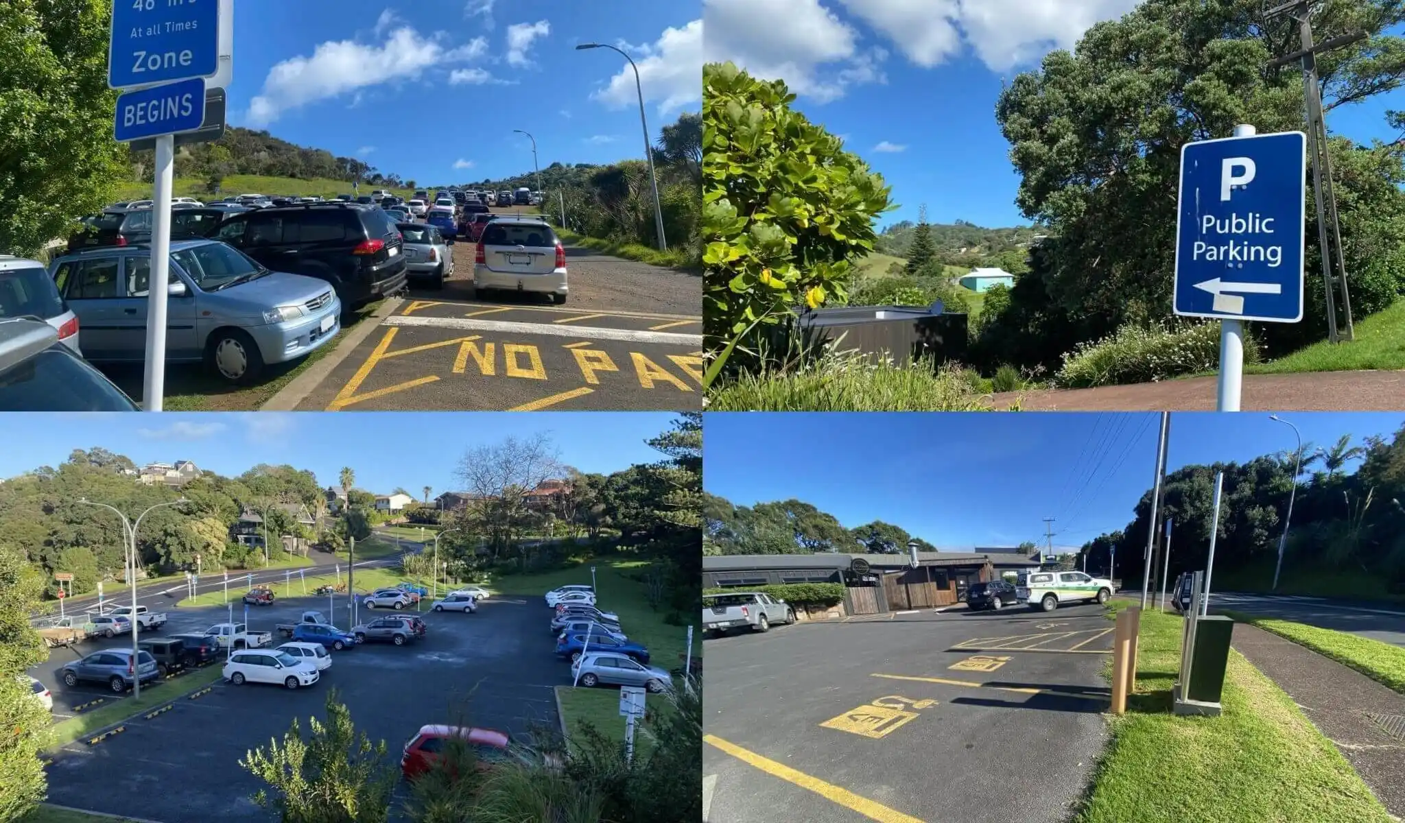 “Onetangi Secret Carpark”- I call it this because the carpark signage is minimal, and trees are now preventing a view of it from the road. This carpark usually has parking available. The parks are free and shade from the trees blocks the sun in the afternoons.