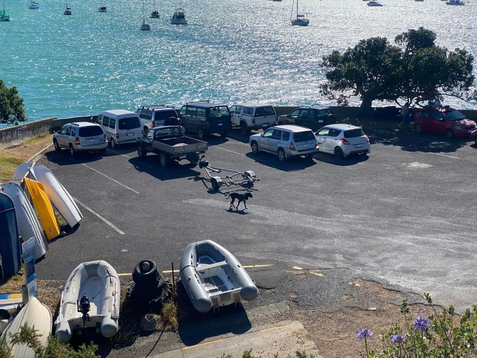 Waiheke locals leave dinghies parked around the storage rack and on the edge of the ramp. About 50 metres back from the parking lot there are about 3-6 gravel carparks. Take care when visiting this carpark as the road has caved in and has not been properly fixed.
