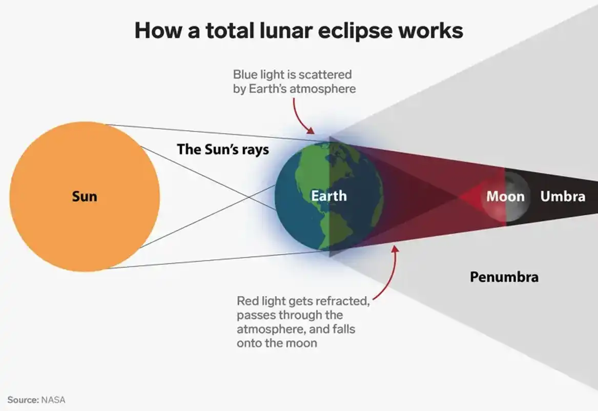 The rare phenomenon is the Blood Moon of 2026. Which only occurs every 2-3 years. The technical name for a blood moon is a Total Lunar Eclipse. A total lunar eclipse happens when the Earth blocks all the Sun’s light from reaching the Moon directly or when the moon earth and sun are in a line. It can only happen during a full Moon. During an eclipse, Earth casts two types of shadows the penumbra and the umbra.