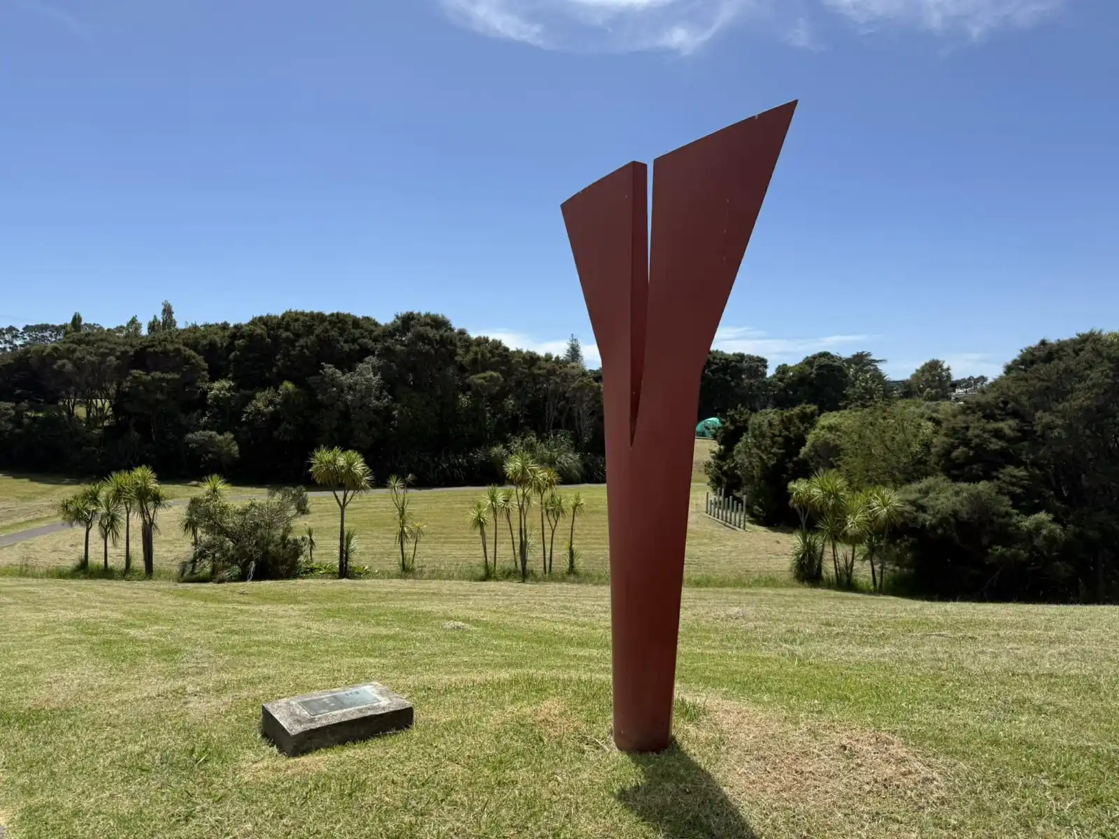 The park showcases several sculptures that featured in past Headland Sculpture on the Gulf exhibitions including a large blue sculpture called “Rangitu III” by Para Matchitt.