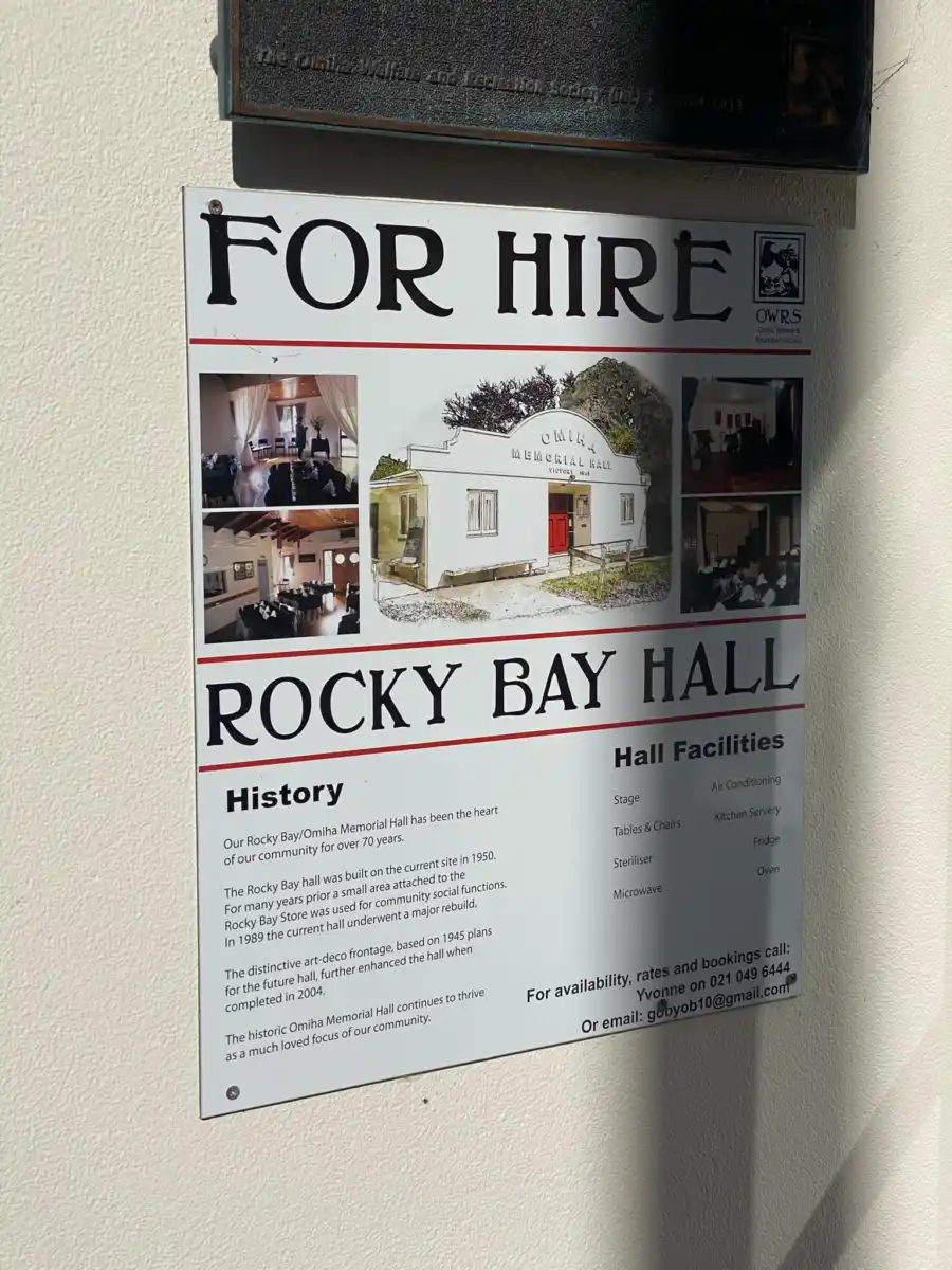 The Omiha Memorial Hall also known as Rocky bay hall was originally built by the Omiha Welfare and Recreation Society soon after world war II in around the 1950’s.