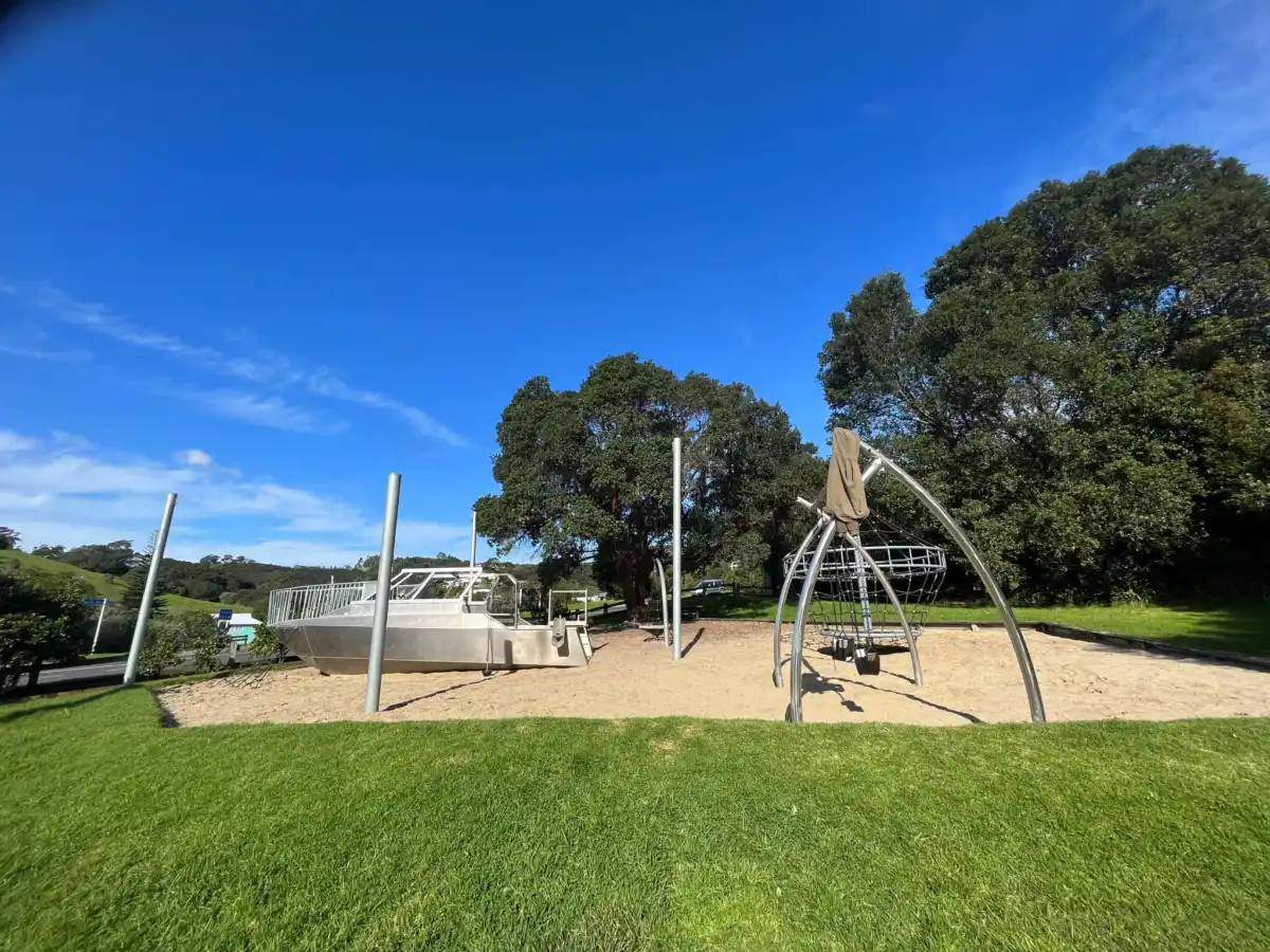 The reserve features swings and roundabouts alongside an aluminum boat structure, making it an enjoyable experience for children of all ages.