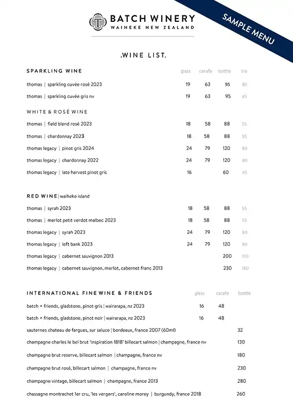 Batch Winery Menu 2025