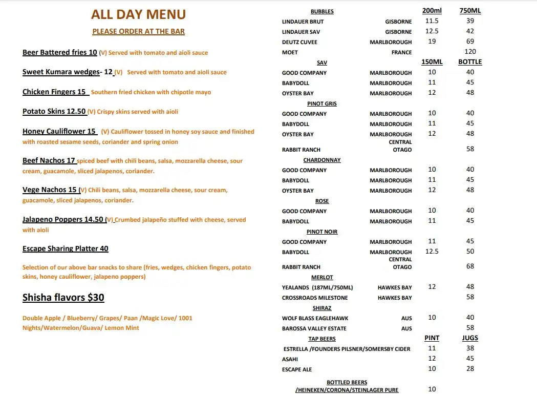 Escape Bar Menu 2025