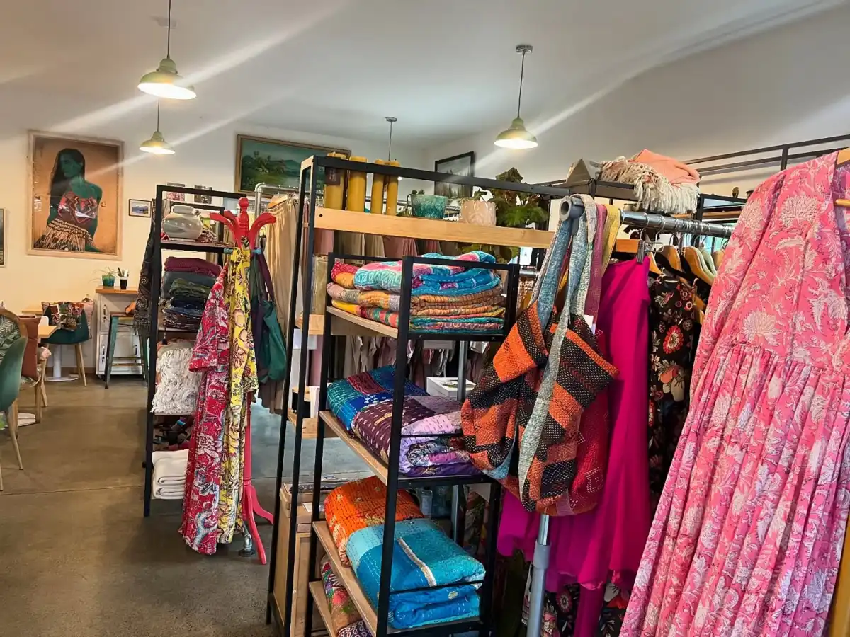 All products are all hand made by artisans in India, New Zealand and Bali, kimonos, quilts and robes are one of a kind, all made with repurposed fabrics, and their food is all handmade in store and all recipes are their own.