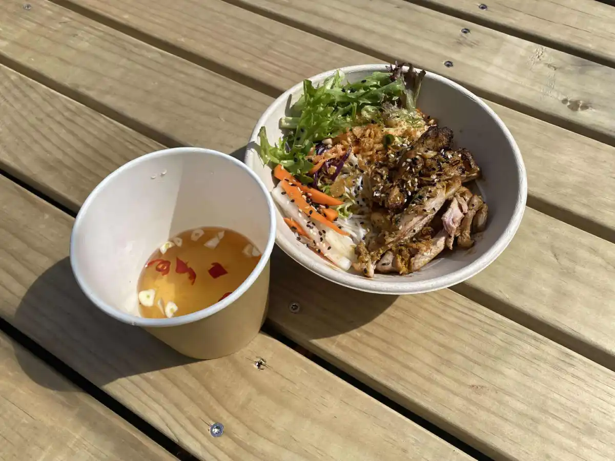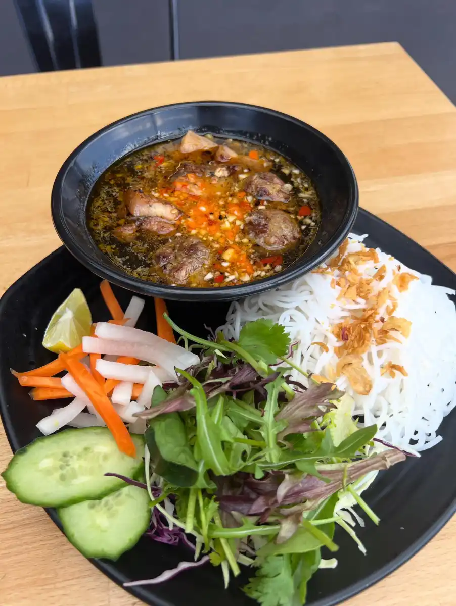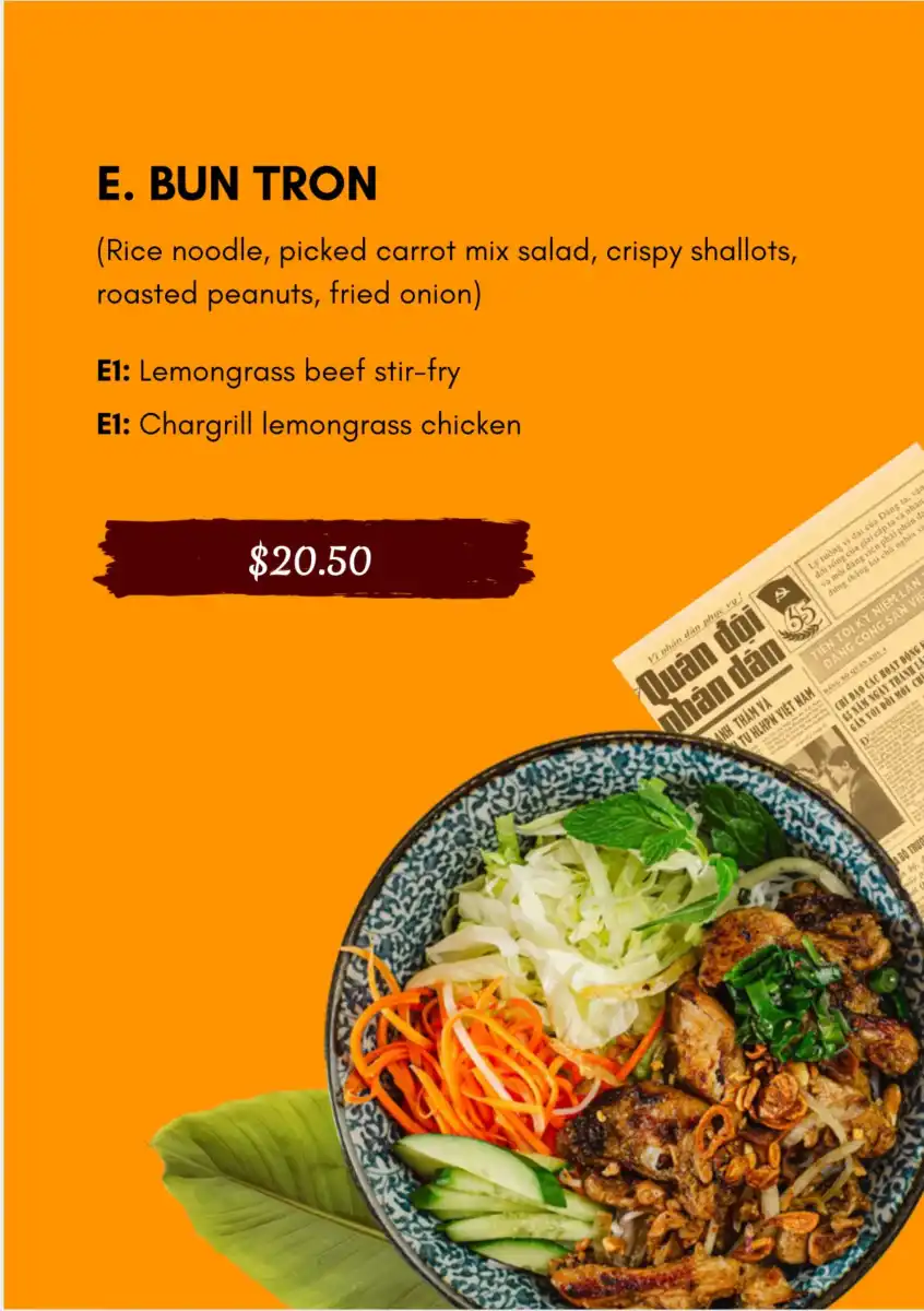 - Bun Tron – Rice noodle, pickled carrot mix salad, crispy shallots, roasted peanuts, fried onion.