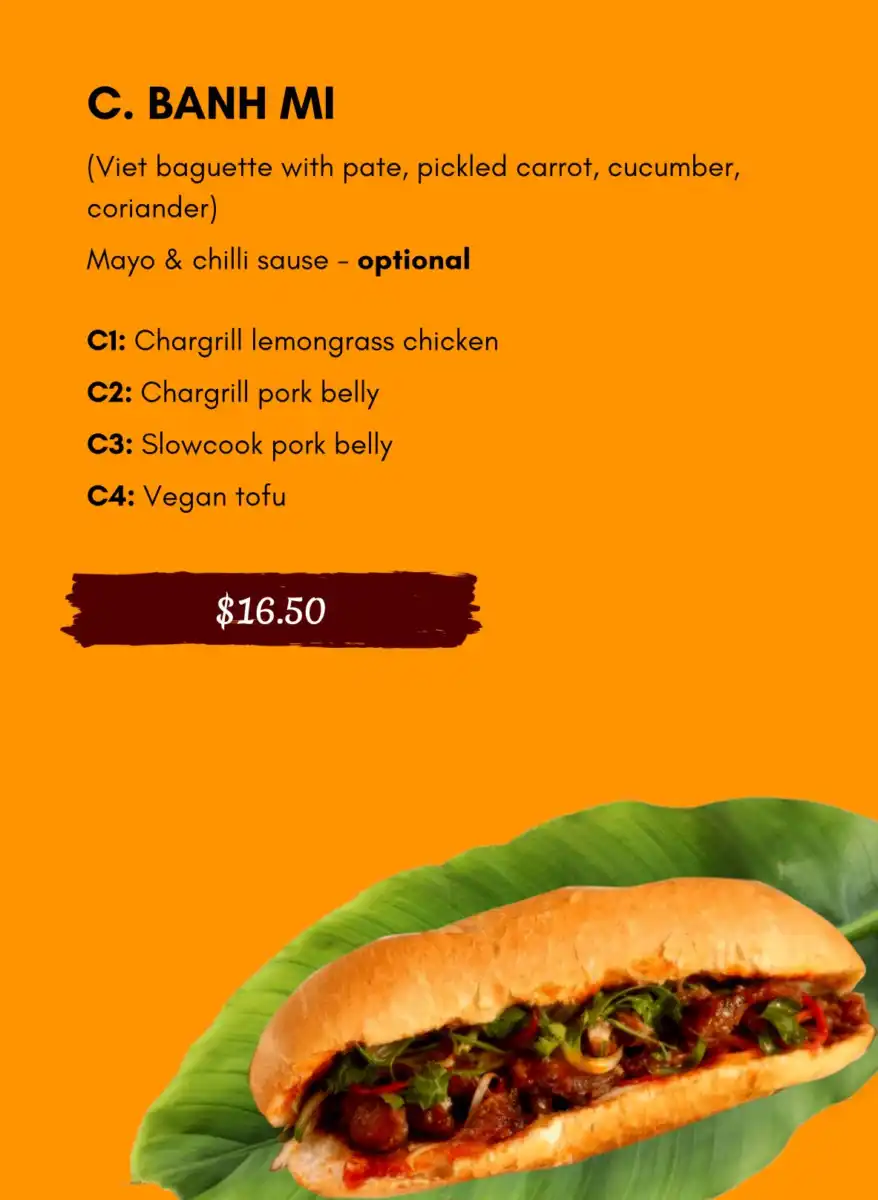 - Banh Mi – Vietnamese baguette with pate, pickled carrot cucumber, coriander and a few meat/tofu options to select from.