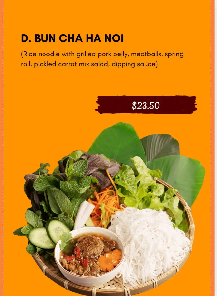 - Bun Cha ha Noi – Rice noodles with grilled pork belly, meatballs, spring roll, pickled carrot mix and dipping sauce.