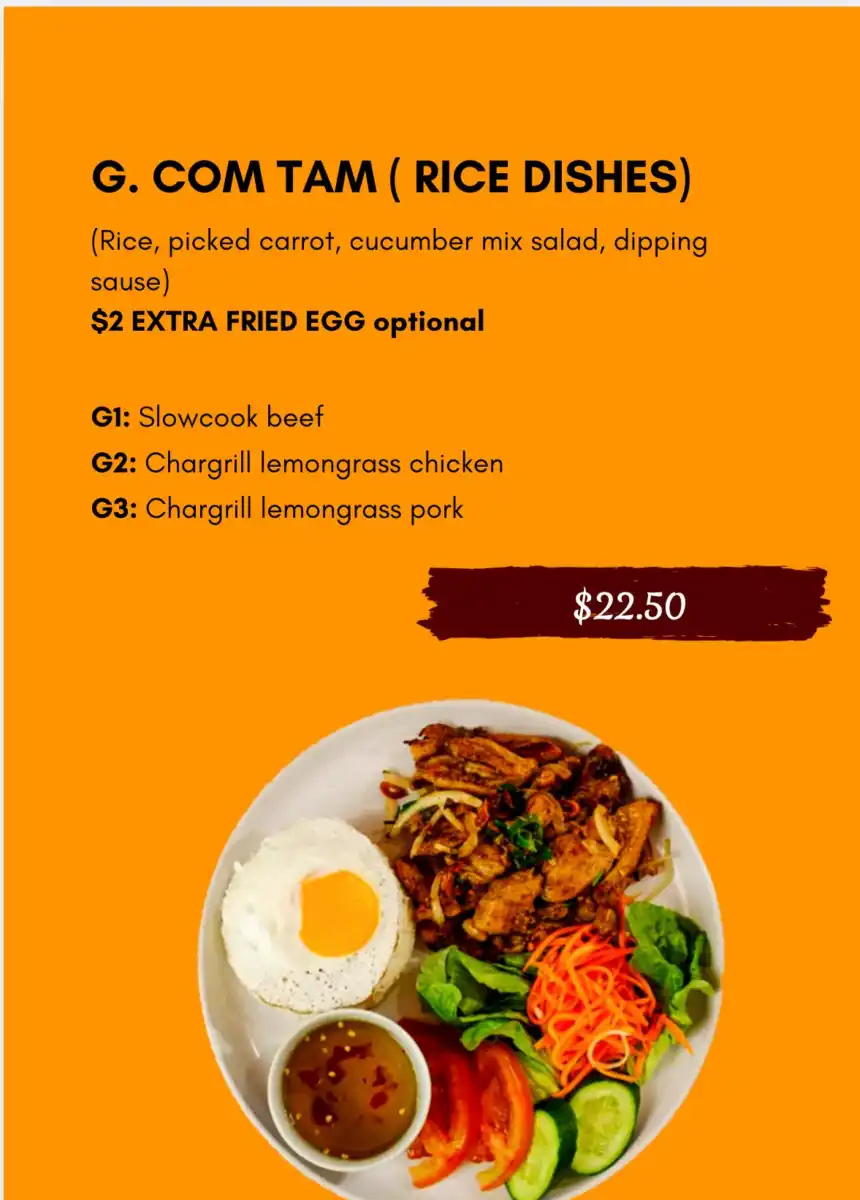 - Com Tam – Rice pickled carrot, cucumber mix salad, dipping Sause and a selection of meat.