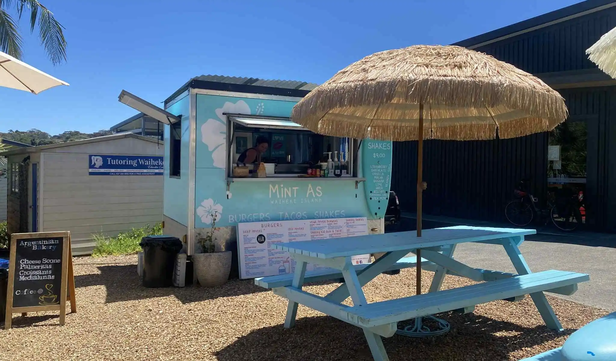 Proud owner and chef is a well known Waiheke local Sarah, she opened her first little blue beach style cart 6-7 years ago. But it all started many years before that, by her cooking and serving delicious burgers at the local sports club. Her cart is the longest standing cart in Putiki Road.