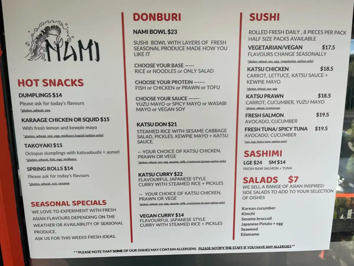 Nami is a takeaway Asian cuisine store, they offer fresh Asian flavours from freshly rolled sushi, salads, noodle soup, dumplings, fried chicken, rice bowls and more.