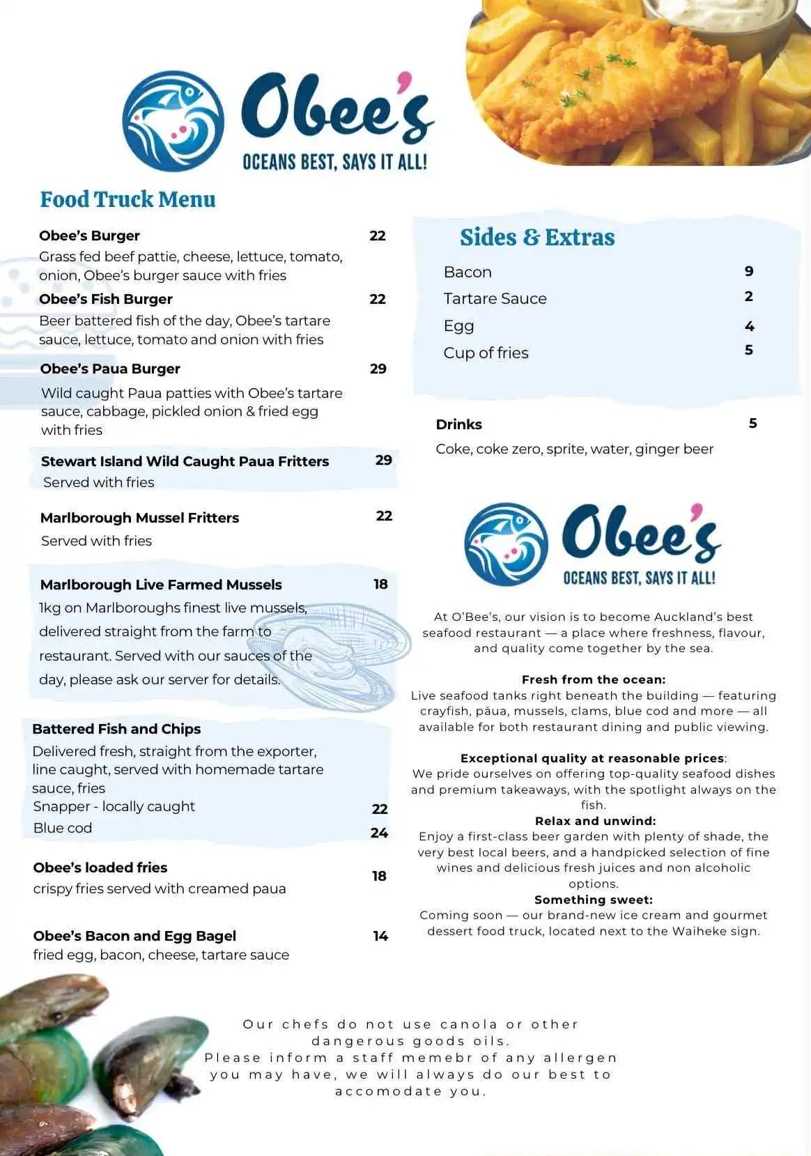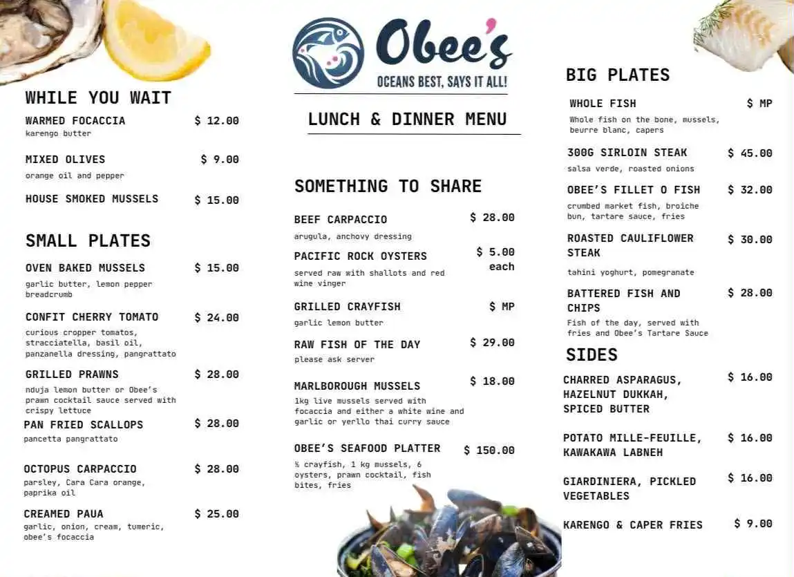 Obee’s also known as “Oceans Best”. Is a restaurant/cafe located in Oneroa. They serve fresh seafood such as crayfish and mussels. They also have a food truck for easy to grab meals.