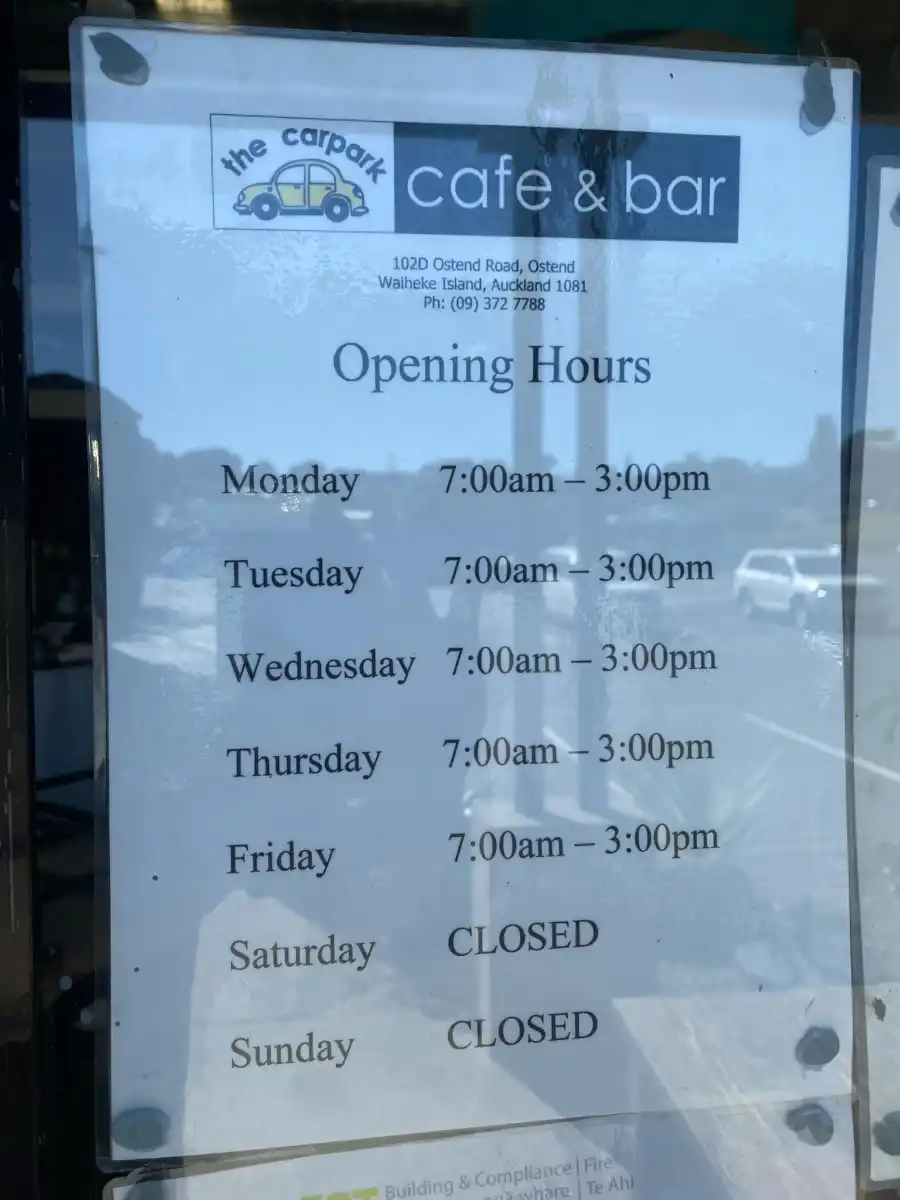 The best way to access The Carpark Cafe would be from either Ostend or Onetangi direction, you just pull into the main accessway for the local businesses like PlaceMakers, Carpark Cafe and Sign Maidens. They have a parking lot for about 10 cars up on the left after the storage yard. These parks are commonly full, so you might have to park on the PlaceMakers carpark on the right, The PlaceMakers carpark on the right is also suited for trucks and longer vehicles.