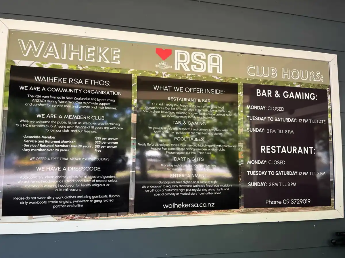 Waiheke RSA is a well known restaurant and bar on Waiheke Island. It features the “Red Poppy” restaurant, darts, snooker, and TAB. It’s famous for its quiz nights, karaoke, and meat raffles. Their restaurant named the “Red Poppy” symbolizes fallen veterans, the RSA gives plenty of money back in support and donations.