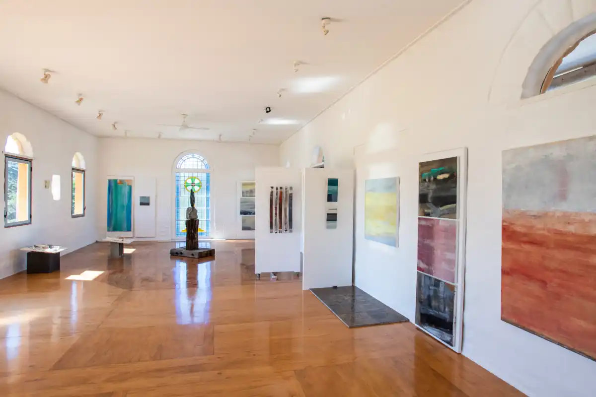 The gallery presents a distinctive, Mediterranean-inspired architectural venue called Casale Di Terra, located in Church Bay.