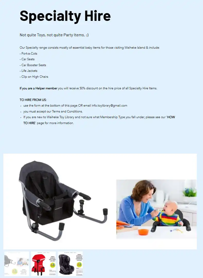 Toy Library Waiheke is small community run rental business located on Hamilton Road. They hire a range of products including educational and fun toys, kids party items, car seats and more.