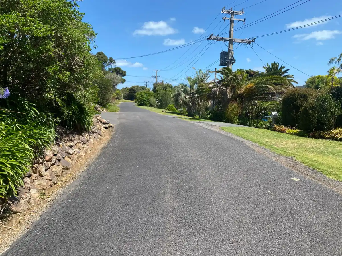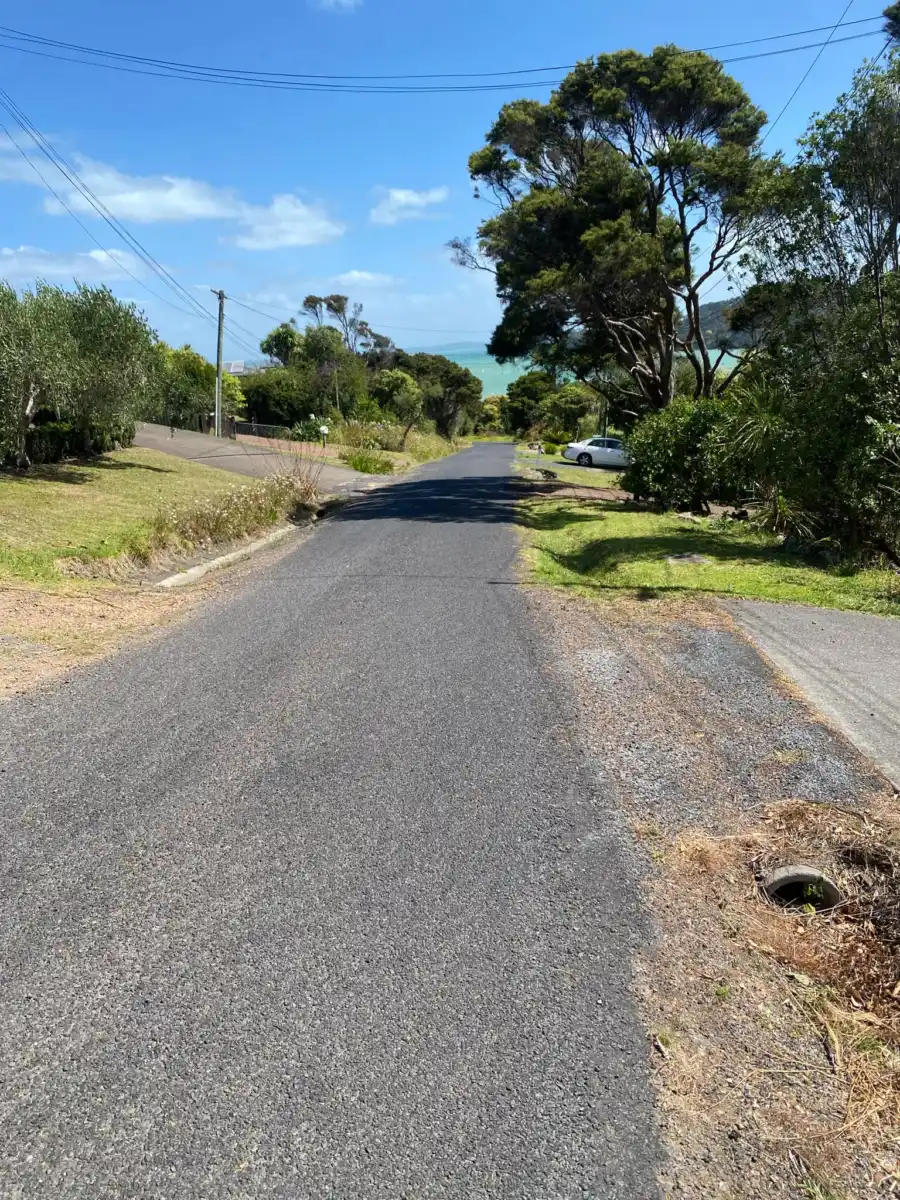 The street has no speed bumps or gravel. The road is not that narrow for a Waiheke side street, with some road side parking available on grass berms.