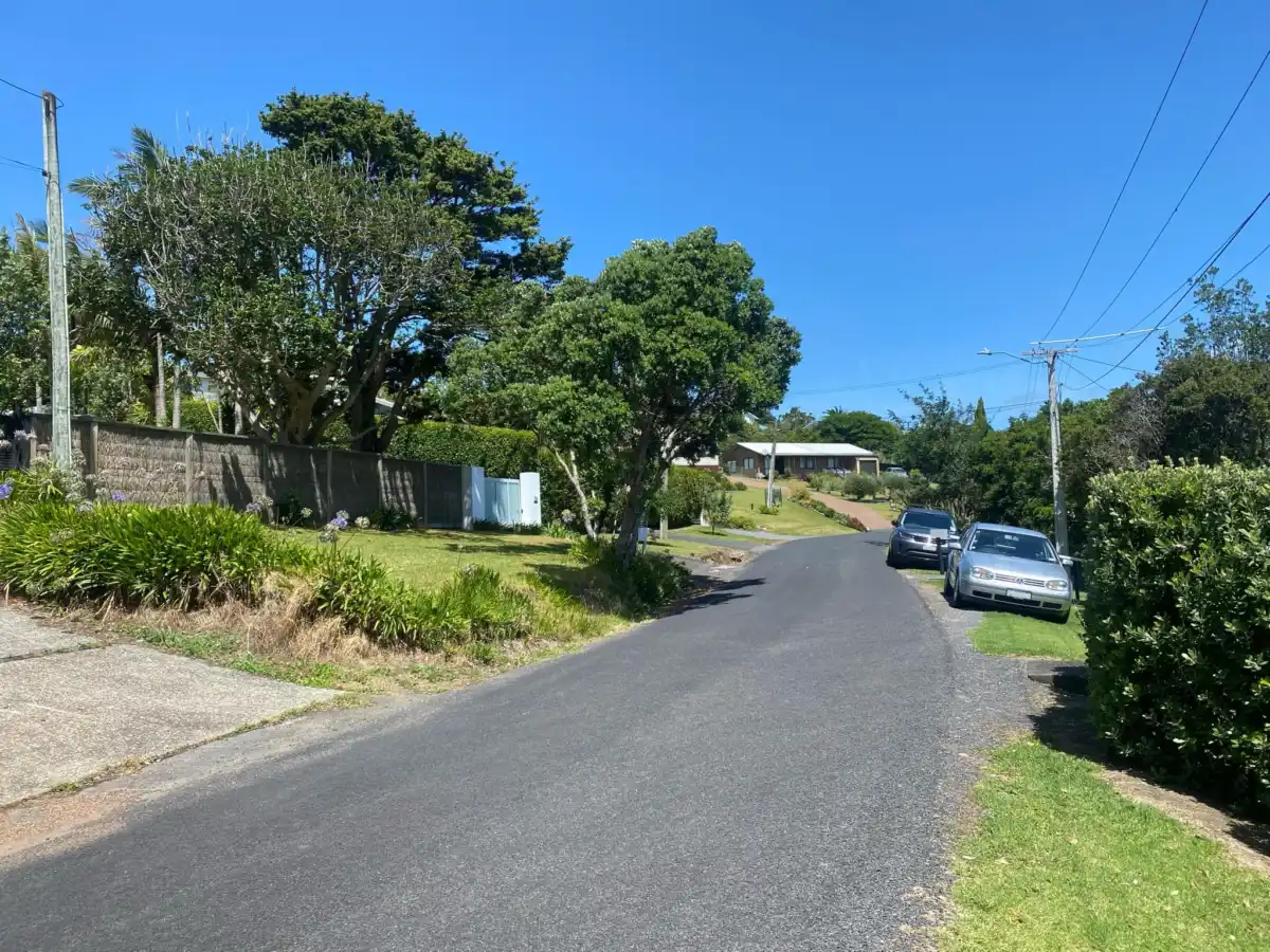 Kiwi street is not a dead end and has no speed bumps or gravel. The road is not that narrow for a Waiheke side street, with some road side parking available on grass berms. The street is close to two beaches, Blackpool and Little Oneroa.