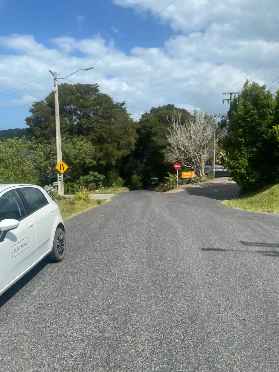 The road has no footpaths and a few grass berms, roadside parking can be very difficult if not impossible on this road. As the road is very narrow and parking on this road would impede the flow of traffic.