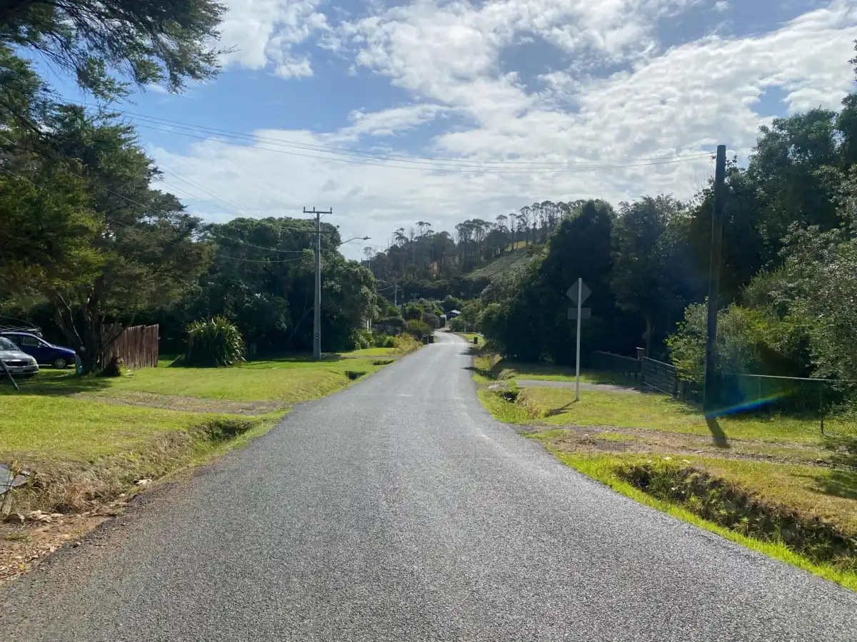 The road has limited footpaths but has some grass berms to walk down for most sections. Some of the grass berms are wide but have a huge ditch so parking on the sides of the road is not available in most places. No beaches are directly on the road but Onetangi beach is only a 5min walk down the hill.