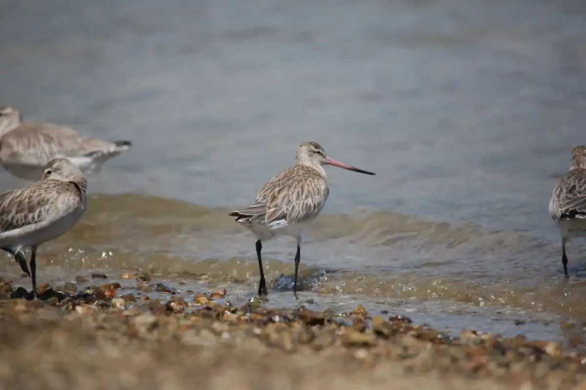 The bar-tailed godwit is the most common Arctic migrant in New Zealand. It is a large long-legged wader, predominantly brown above, pale below, with a long tapering and slightly upturned bi-coloured bill, pink at the base and black towards the tip.