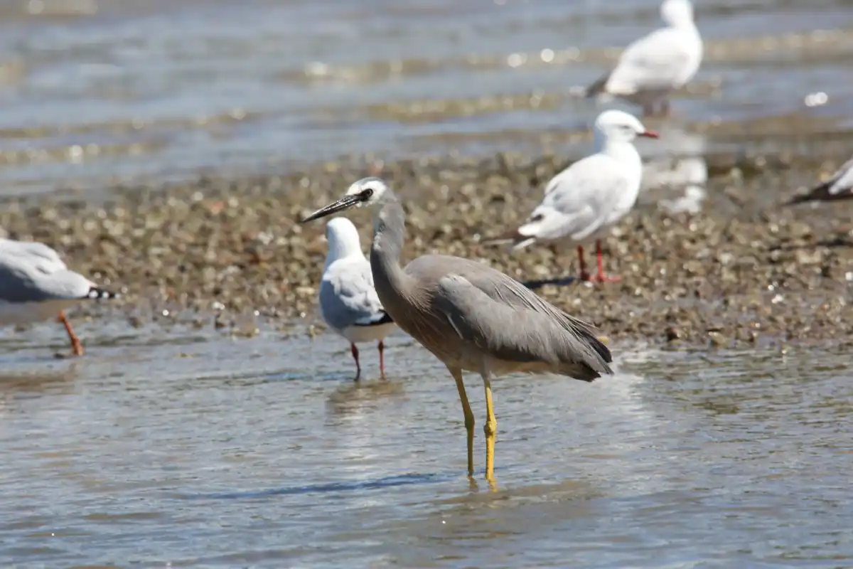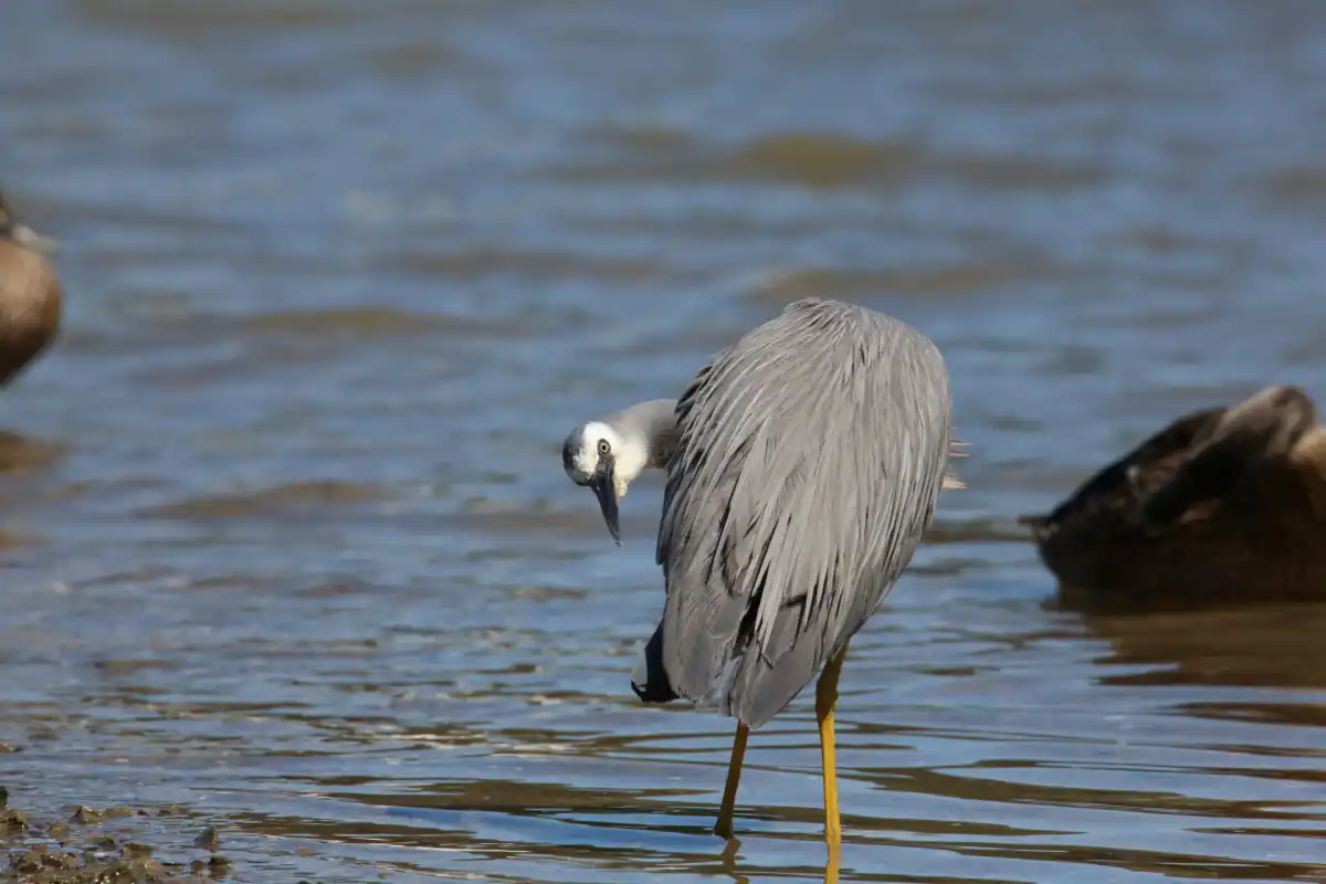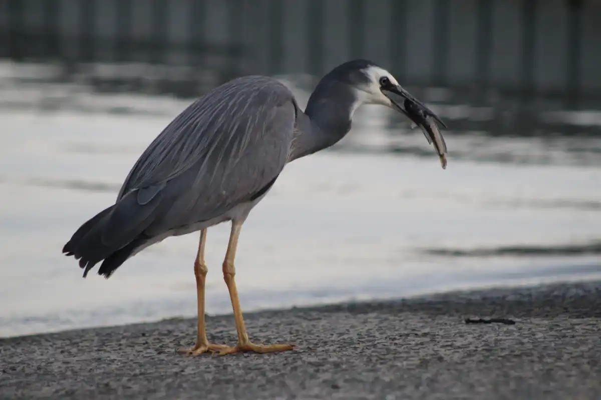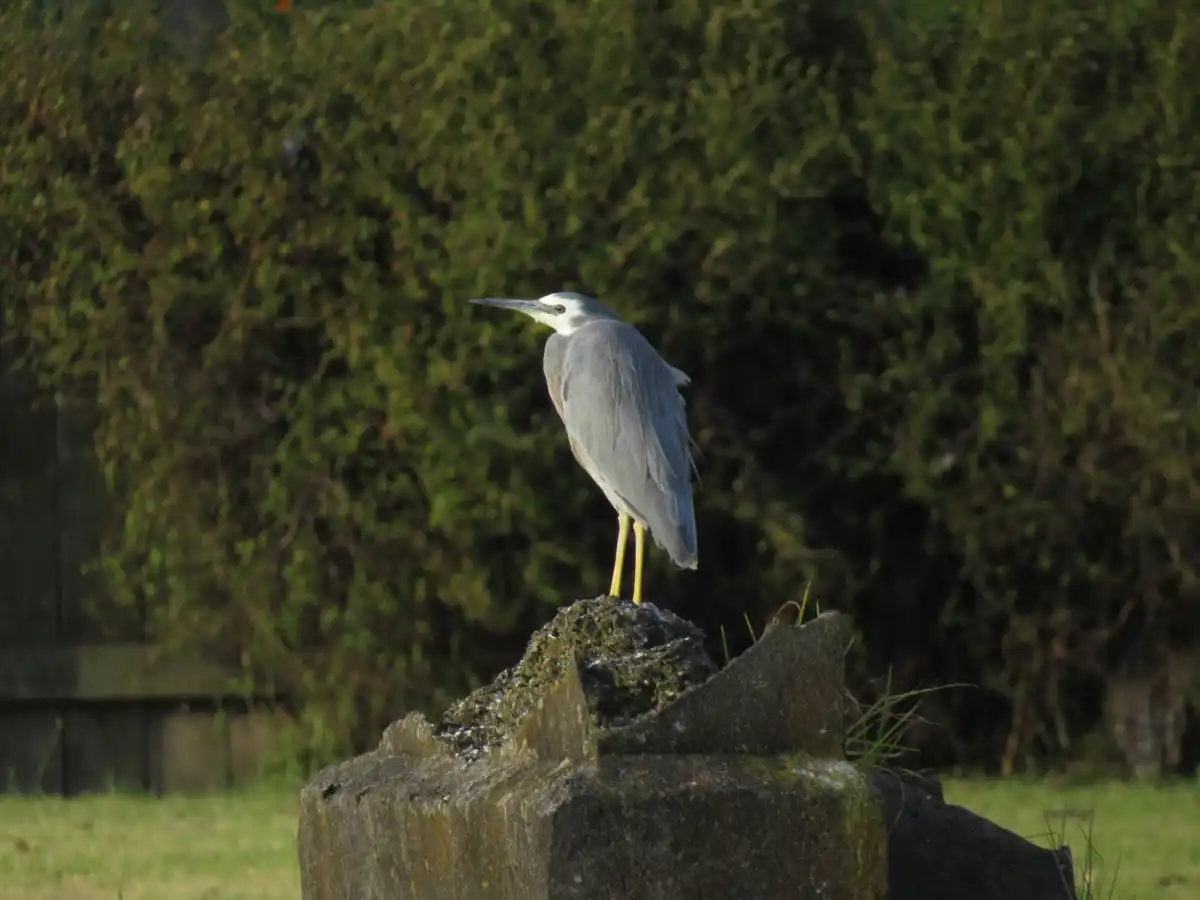 The white-faced heron is a tall, elegant, blue-grey bird usually spotted stalking prey. Locations found on Waiheke are Mangroves, Anzac bay and quiet beaches.