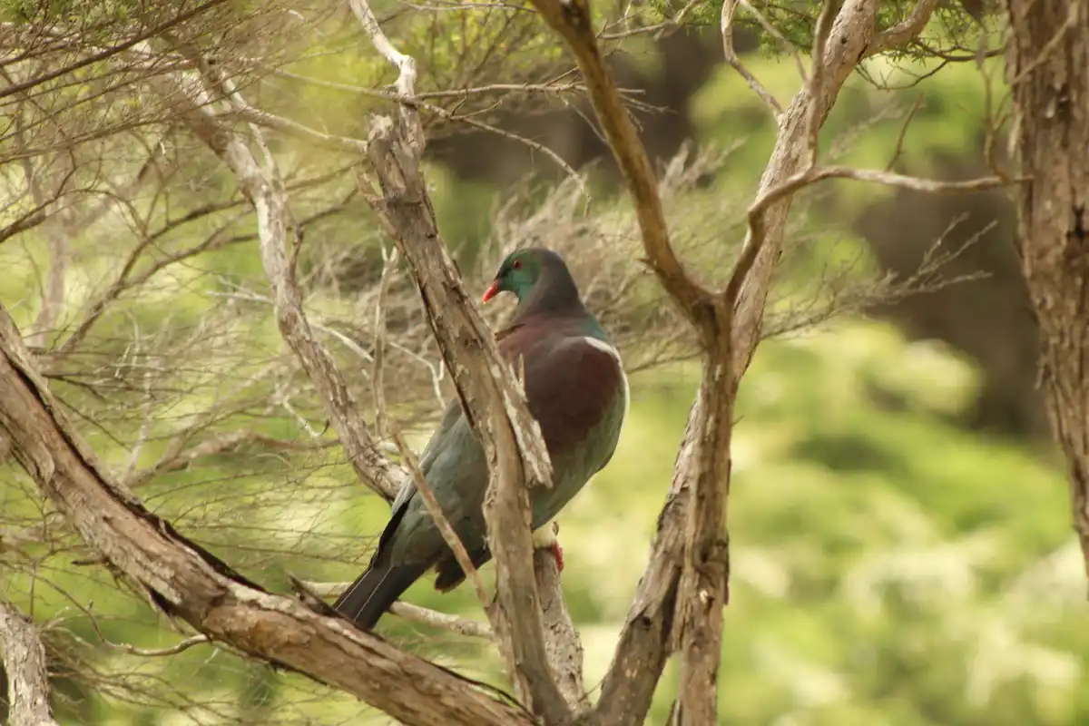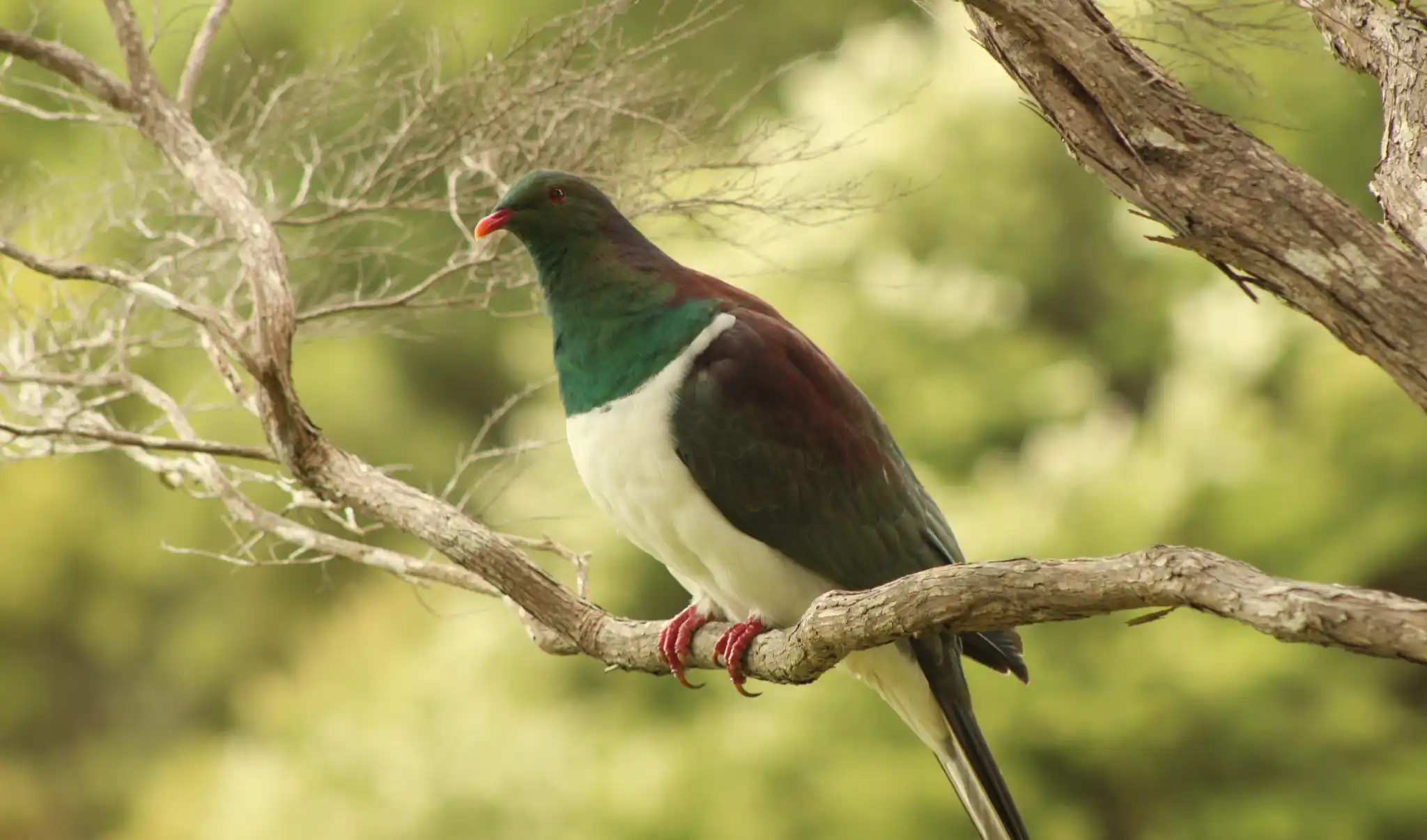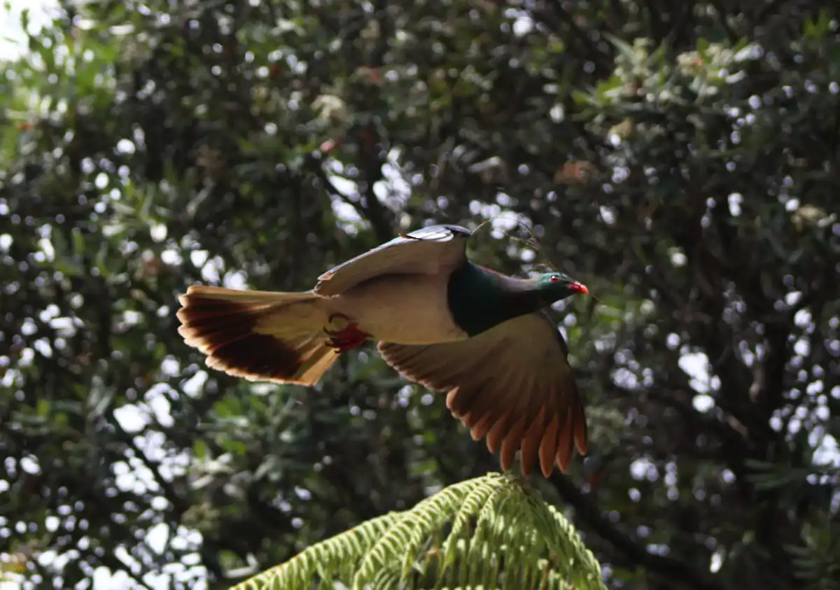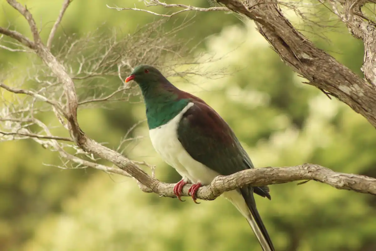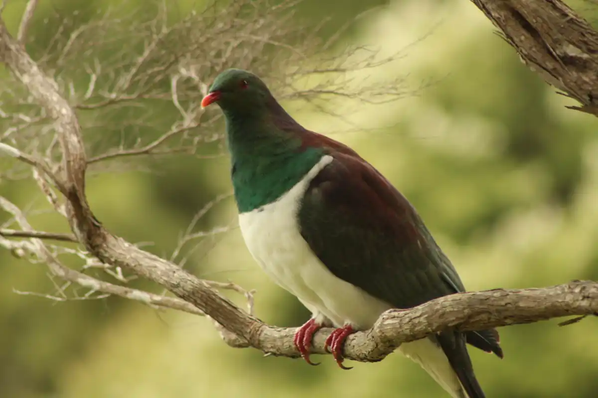 The Wood pigeon also known as a “Kereru” has a red bill, feet and eyes. The upperparts are blue-green with purple-bronze iridescence on the neck, mantle and wing coverts, and the underparts are white with a sharp demarcation between the white and blue-green on the upper breast.